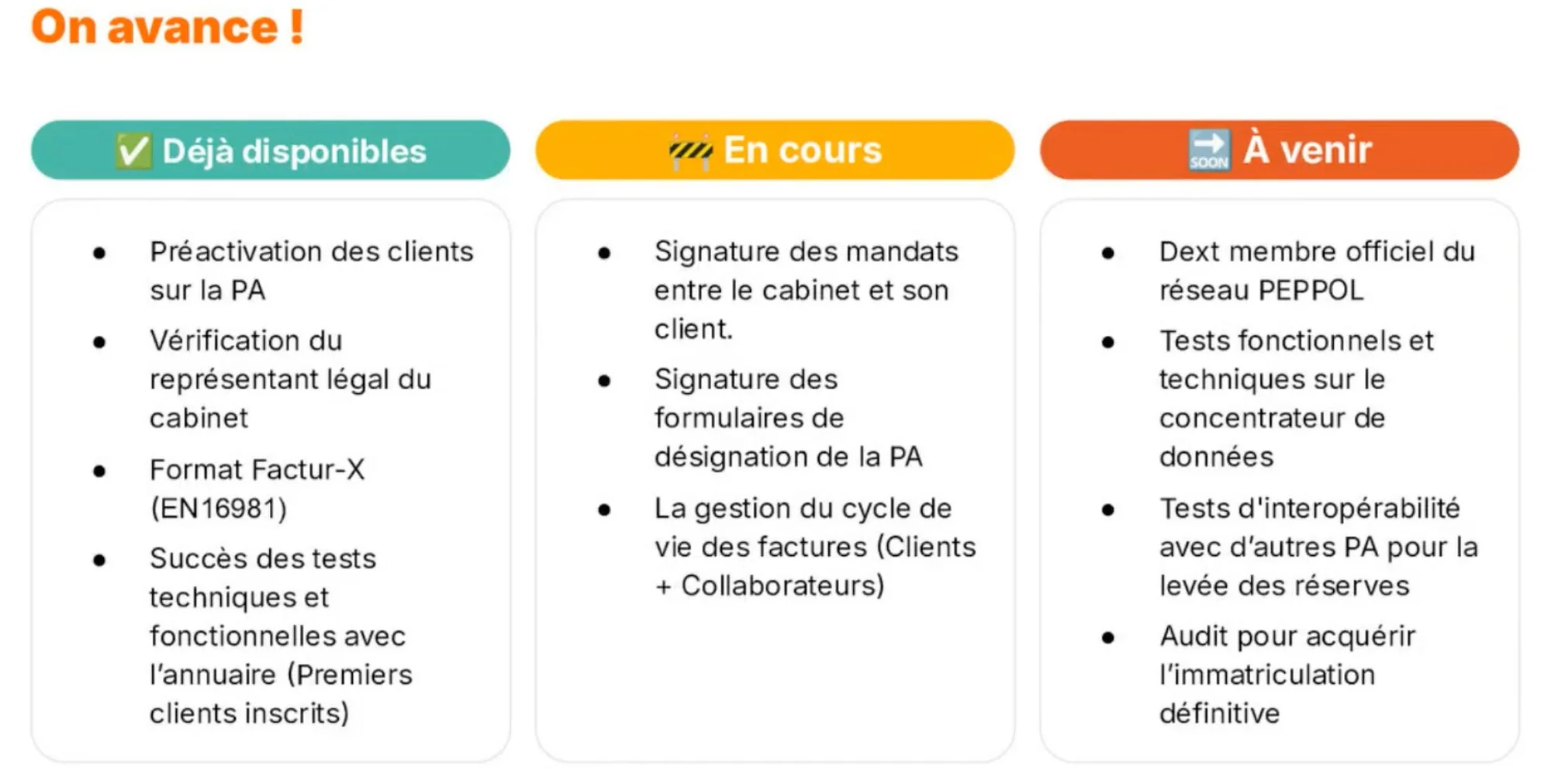 Comme chaque trimestre, nous vous détaillons pas à pas les développements terminés, ceux en cours et ceux à venir. L’information importante actuellement, c’est le succès qu’obtient Dext dans tous les tests demandés par la DGFIP en vue de l’agrément définitif de sa plateforme agréée. L’audit exigé pour cette dernière étape de l'immatriculation devrait intervenir fin 2025. Pour information, nous réalisons nos tests d’interopérabilité avec d’autres plateformes en passant par le réseau Peppol.