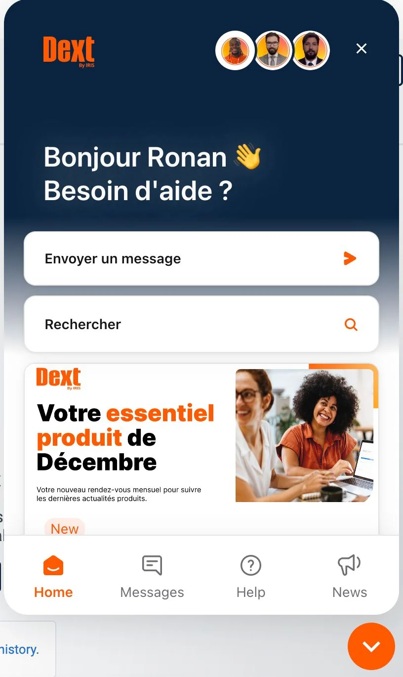 Pour éviter de rater des nouveautés sur notre plateforme Dext : un petit icône cliquable, en bas à droite de l’écran, donne accès aux informations essentielles sur les développements récents. C’est aussi un moyen simple de s’inscrire au prochain webinaire organisé par Dext.