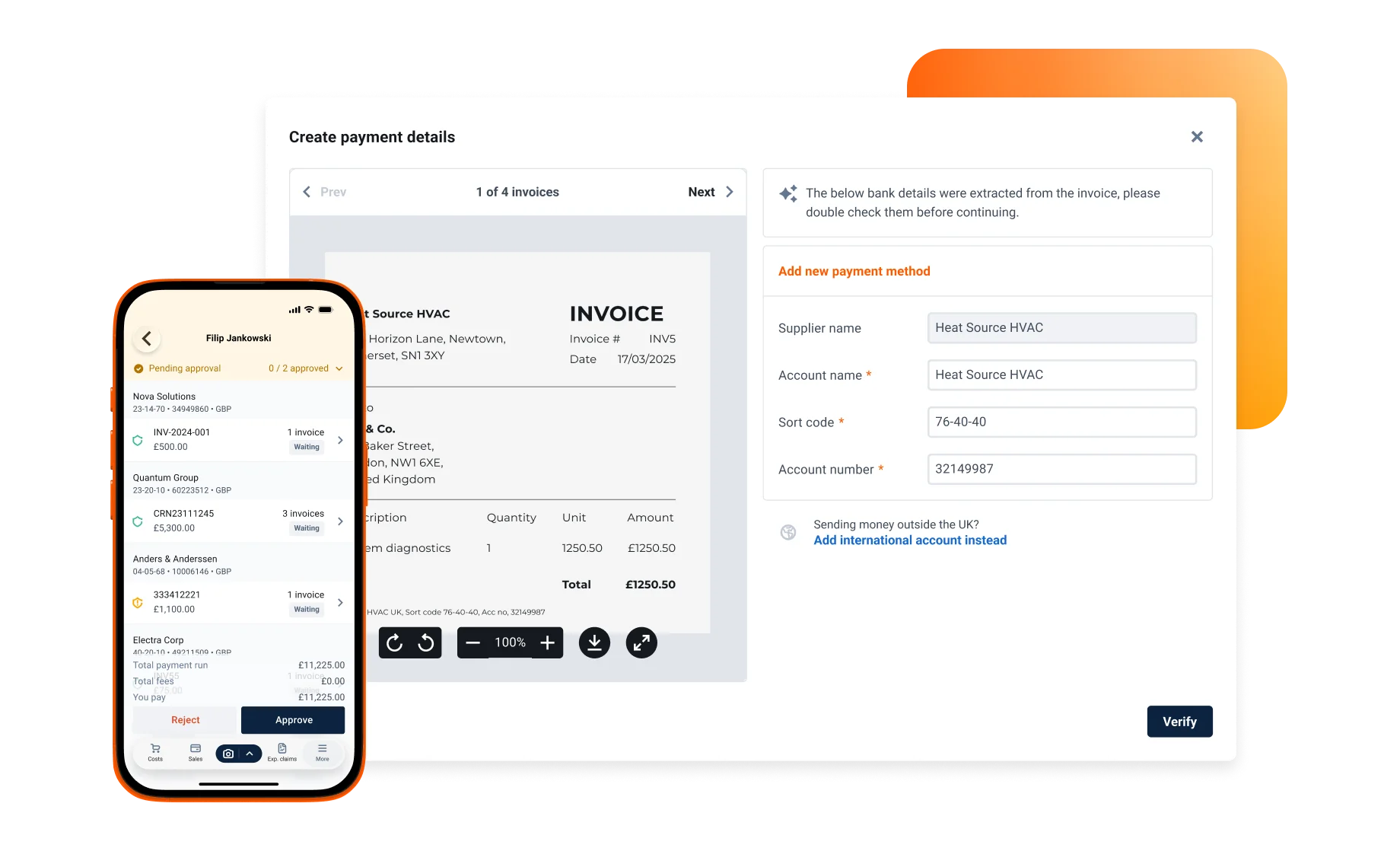 Payments in Dext has built-in security at every step, with safeguards that flag potential risks early to help prevent errors and fraud — so you can pay with confidence every time.